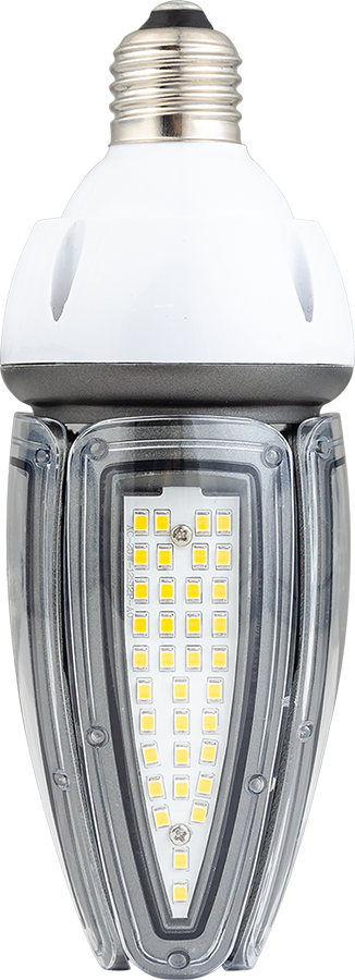 Металлический цоколь, светодиодные платы из стеклотекстолита расположены по периметру корпуса. Источник питания установлен внутри.